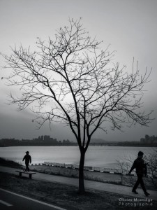 « Cette photo a été prise dernièrement sur les bords du fleuve Han près de Jamsil au sud est de Séoul. Un endroit où l’on peut courir, se promener, faire du vélo. Ce n’est pas la place qui manque par là-bas. Séoul est une ville à la population très dense mais avec aussi de grands espaces. Ça compense. Après avoir marché un bon moment et après de nombreuses prises de vues, j’ai fait cette image qui est l’exemple type de photo que je ne pouvais imaginer faire avant d’être à cet endroit précis. Cet arbre s’est présenté à moi au moment où une éclaircie était visible derrière ses branches. »
