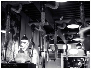 “Il est 18h environ et les coréens sont déjà à table pour dîner. Avec parfois un petit-déjeuner et déjeuner pris rapidement par manque de temps, le dîner est un moment privilégié. Au restaurant, rarement seul, plutôt entre amis, camarades ou collègues de bureau, le repas du soir est copieux et souvent arrosé. L’alcool accompagne très souvent des plats épicés ou soupes brûlantes qui ont la préférence des coréens. Ces tuyaux flexibles partant du plafond sont des hottes individuelles destinées à aspirer les odeurs de graillons et autres cuissons. Elles participent également au charme de ces endroits où, la nuit tombée, l’ambiance est détendue et conviviale.”