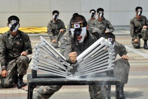 REPUBLIQUE DE COREE, Incheon : des soldats de Corée du Sud effectuent des entrainements d’arts martiaux en marge d’un exercice anti-terroriste, le 13 Juin 2013. Incheon accueillera des tournois de sports comme le billard, la danse ou le kickboxing, cet été, dans le cadre des préparatifs des Jeux asiatiques de 2014. AFP PHOTO / JUNG YEON-JE