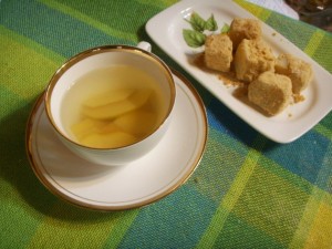 Incorporer de fines tranches de ginseng, gingembre, cannelle, coing et Jujube dans de l’eau puis laisser mijoter jusqu’à ce que le le volume d’eau diminue de moitié.